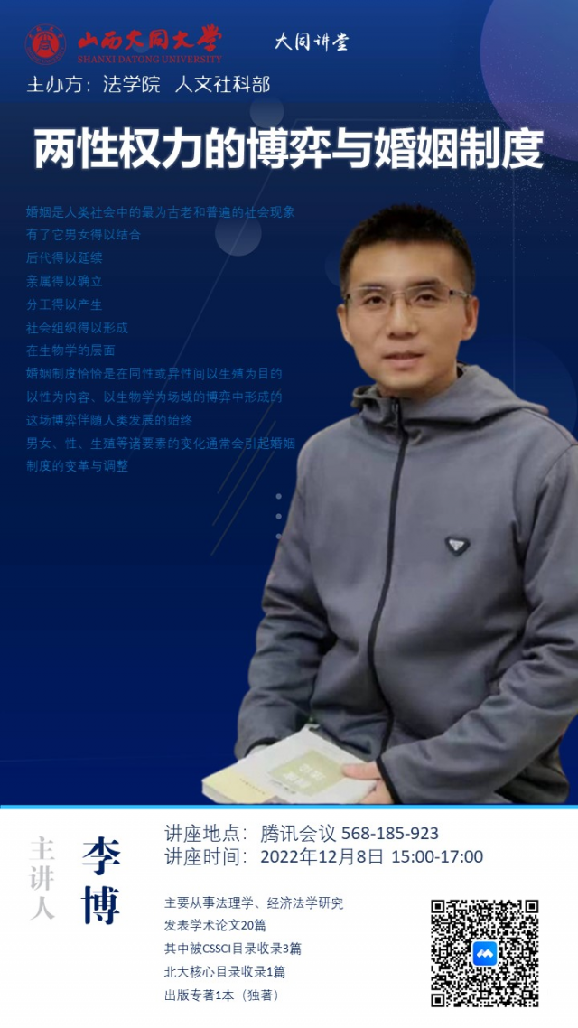 婚姻是人类社会中的最为古老和普遍的社会现象。有了它,男女得以结合、后代得以繁衍、亲属得以确立、分工得以产生、社会组织得以形成。为进一步提升我院学生对婚姻与两性关系的认识,12月8日下午,李博老师通过线上平台开展以“两性权力的博弈与婚姻制度”为主题的讲座。