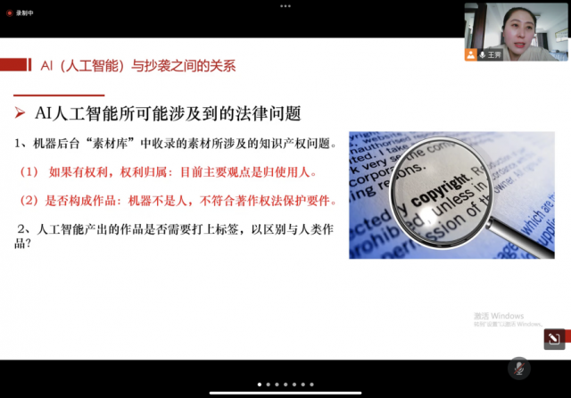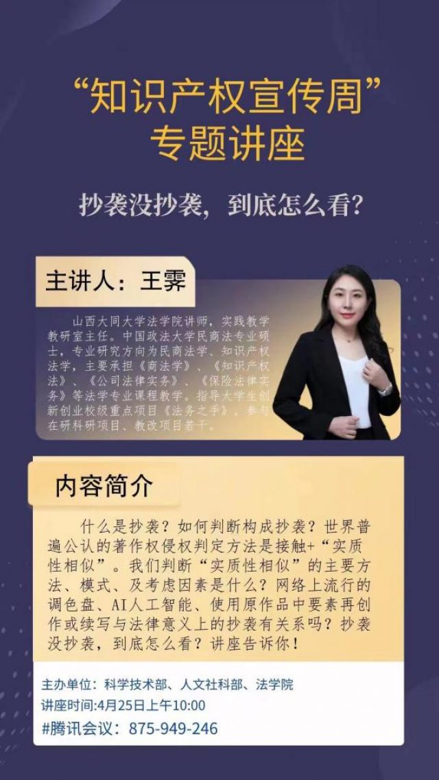 为迎接我国第22个知识产权日,我校科学技术部、人文社科部、英国365上市集团联合举办“知识产权宣传周”专题讲座系列活动。4月25日上午10时,由我院教师王霁主讲的题为“抄袭没抄袭,到底怎么看”的知识产权法专题讲座在腾讯会议拉开帷幕,全校部分师生聆听了讲座。